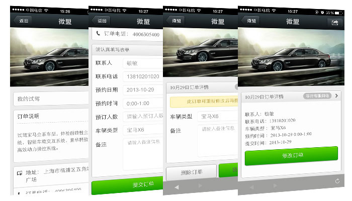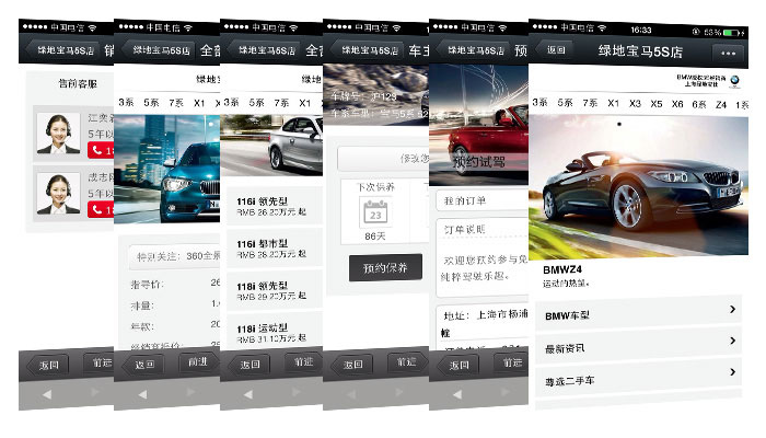微汽车采用微商通平台进行汽车的销售管理、预约保养、预约试驾、保险计算、车贷计算、车型比较、违章查询、360度全景看车、车主关怀等功能,整个过程非常便捷,省时省力省心,并通过与微商通平台有交互能力的手机客户端,快速便捷的实现了商家的销售管理与预约过程,同时也实现了客户无需进入4s店就能进行预约保养和试驾的功能。