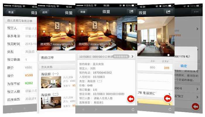 5、提供服务:用户直接可在公众账号进行预约房间、预约餐厅等操作。