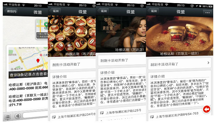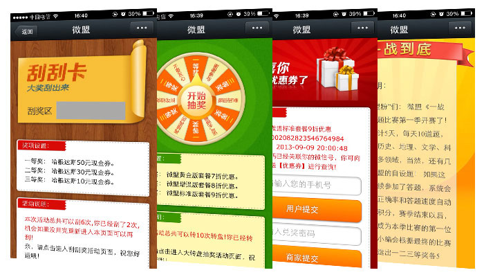 我们将利用微信的强交互性,让您通过对互动流程、环节和方式的设计,运用各种设计活动从而实现与用户的互动交流,,微整合系统互动符合微信娱乐性强的产品本质,微商通内置了专为商家定制的“商家营销服务模块”,包括优惠券推广模块、幸运大转盘推广模块、刮刮卡抽奖模块、微投票、一战到底等功能模块,商家通过发起营销活动,对已有客户进行再营销,通过不断更新补充主题,用户可以反复参与,并可带动周边朋友一起分享,从而形成极强的口碑营销效果。