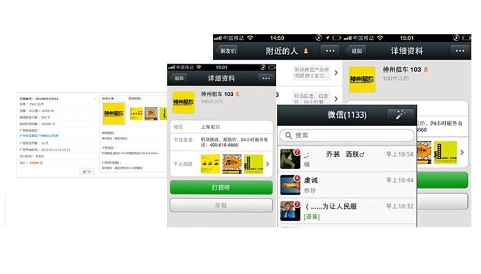 Location Surround Push(基于附近的人的消息推送)微信中基于LBS(基于位置的服务)的功能插件“查看附近的人”便可以使更多陌生人看到这种强制性广告。 用户点击“查看附近的人”后,可以根据自己的地理位置查找到周围的微信用户。在这些附近的微信用户中,除了显示用户姓名等基本信息外,还会显示用户签名档的内容。所以用户可以利用这个免费的广告位为自己的产品打广告。 营销人员在人流旺盛的地方后台24小时运行微信,如果“查看附近的人”使用者足够多,这个广告效果也会不断随着微信用户数量的上升,可能这个简单的签名栏也会变成会移动的“黄金广告位”。