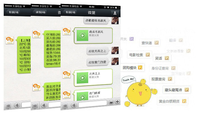 有小黄鸡陪聊加强版510万数据,过滤了广告和一些敏感词汇。 还有天气查询 ,手机查询,邮编查询,快递查询(支持160家快递公司),身份证查询,人品计算,翻译,字典,百科(全网数据),音乐80.1万 ,笑话5万条,小黄鸡陪聊510万条,诗词23万首,诗句 225万,成语5万,谜语5万,解梦3万,糗事55万,公交线路4万,火车线路4500,机器人学习功能等等......