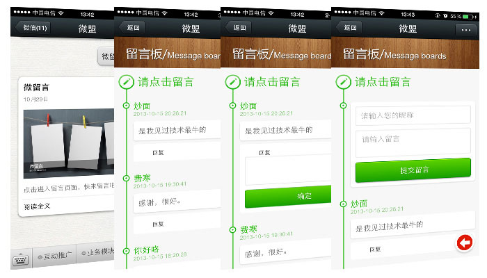 “微留言”是一种能为商家带来巨大的社会化流量的功能,允许留言可以被分享于留言者的朋友圈、腾讯微博和发送给好友,这意味着留言可以被无数的粉丝分享,用户对商家进行实时且客观的评价,真实的社交环境保证了留言的客观性和有效性。“微留言”的使用商家只需做好产品和用户服务即可,随着口碑的传播,消费者将源源不断。